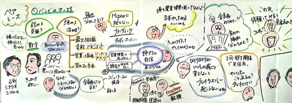 ――ここからは各ペアにお話を伺います。最初は、ペアレースで見事に優勝した「バンビ×マー坊」のペアです。2人の初回のペア対話は、私には完全に「先生と生徒」に見えました。バンビがマー坊に「こうしたほうがいい」「この本を読んだらいい」と一方的に伝え、マー坊はそれを静かにありがたく受け取るという関係性になっていたのです。悪い関係ではないのですが、問題は2人とも「先生と生徒」の立場というコンフォートゾーンにいて、バンビが熱弁を振るい、マー坊のエネルギーはいっこうに高まらないことにありました。そこで私は、そのことをフィードバックしつつ「ロールチェンジ」を提案してみました。つまり、マー坊が自分の好きなマンガやゲームをバンビに薦めたり、バンビが聞き役になってマー坊の思いや拘りを聞いたのです。そうすると、2人ともエネルギーが高まっていく様子が見て取れたので、私はその関係性でいきましょうと背中を押しました。